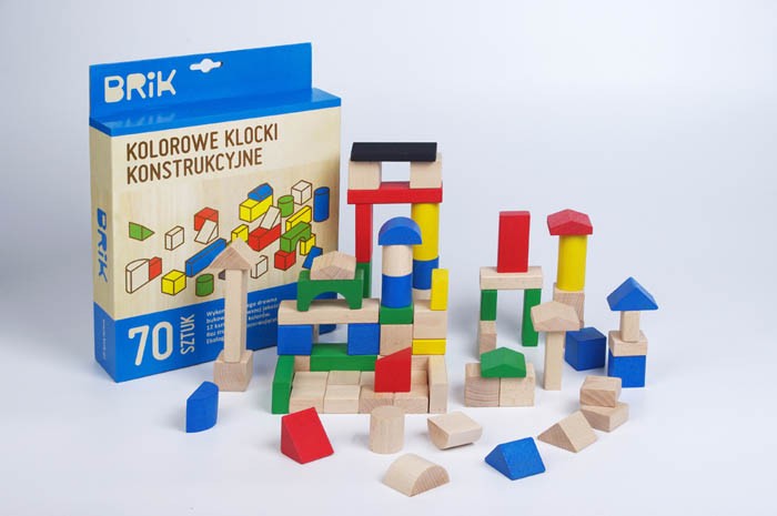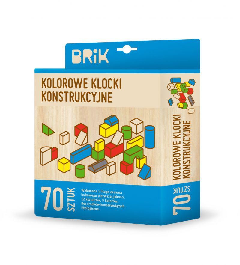 Kolorowe drewniane klocki konstrukcyjne firmy BRIK, w zestawie znajduje się 70sztuk drewnianych klocków o 12 różnych kształtach (wśród nich unikalny drewniany klocek daszek). Drewniane Klocki BRIK są malowane ręcznie w 5 różnych kolorach.