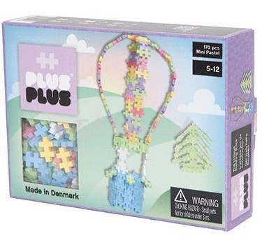 Zestaw plastikowych klocków Plus Plus w rozmiarze mini, zestaw zawiera 170 sztuk klocków w kolorach pastelowych oraz propozycje wykonania modeli takich jak: drzewo, ludzik, samolot.