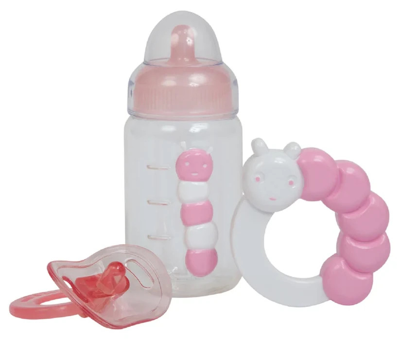Firmowy, oryginalny zestaw akcesoriów dla lalki firmy JC Toys (Berenguer) składający się z trzech elementów, tj. smoczka, butelki oraz grzechotki. Idealny zestaw dla "małej mamy" do pielęgnacji swojej lalki.