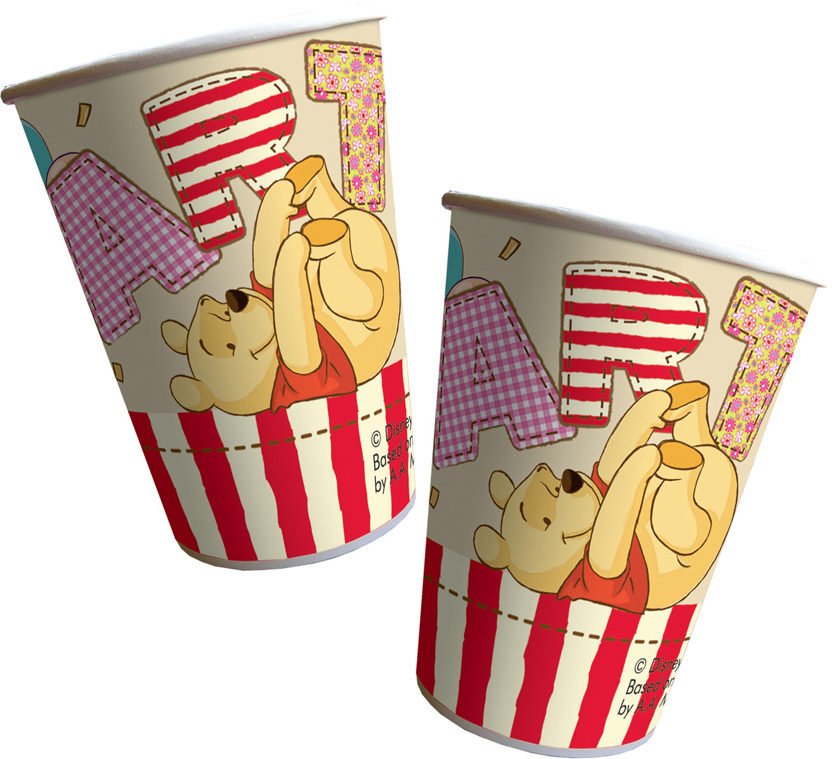 Papierowe Kubeczki Party "Kubuś Puchatek, W zestawie 8 sztuk kubków wykonanych z papieru o pojemności 200 ml każdy. Do nabycia także talerzyki z Kubusiem.