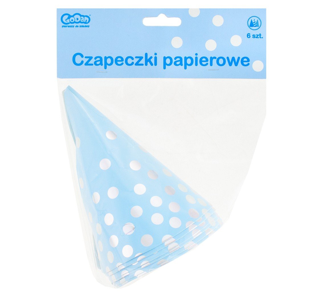 W zestawie 6 sztuk papierowych czapeczek w błękitnym kolorze z nadrukowanymi srebrnymi kropkami. Do czapeczki przymocowana jest biała gumka.