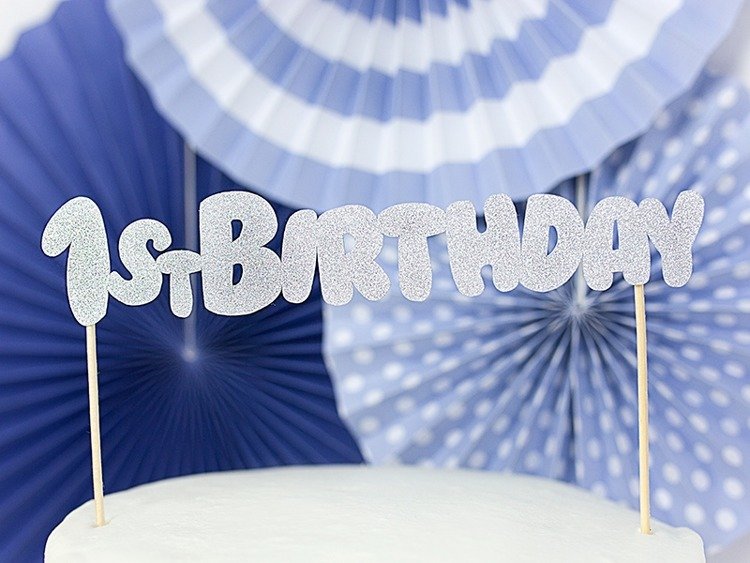 Topper na tort wykonany jest z papieru lustrzanego w kolorze srebrnym brokatowym. Napis "1st Birthday" przymocowany jest do dwóch drewnianych patyczków które wbijamy do tortu urodzinowego. Wysokość ok. 19,5 cm.