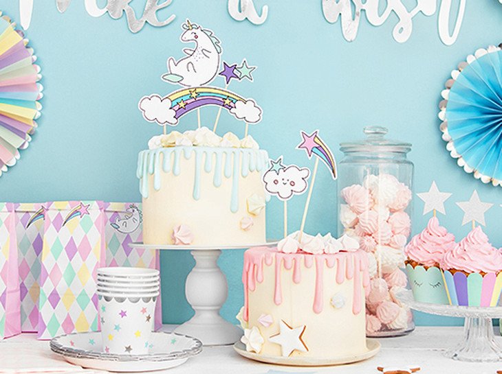 Topper na tort Jednorożec, składający się z 5 elemntów widocznych na zdjęciach.