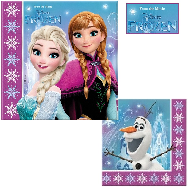 W paczce znajduje się 20 papierowych serwetek w rozmiarze 33 cm, z nadrukowanymi bohaterkami z bajki: "Frozen - Kraina Lodu", Anna i Elsa.