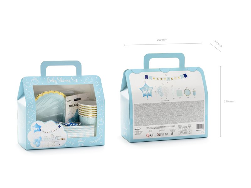 W zestawie znajdują się dekoracje takie jak girlanda, kubeczki papierowe, talerzyki, słomki, serwetki, foliowy balon z napisem "It's a boy" oraz balony lateksowe.