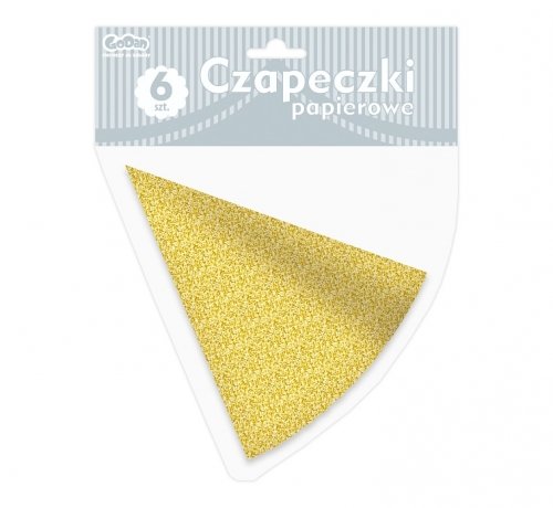 W zestawie znajduje się 6 sztuk papierowych czapeczek w złotym połyskującym kolorze (brokat). Do czapeczki przymocowana jest biała gumka.