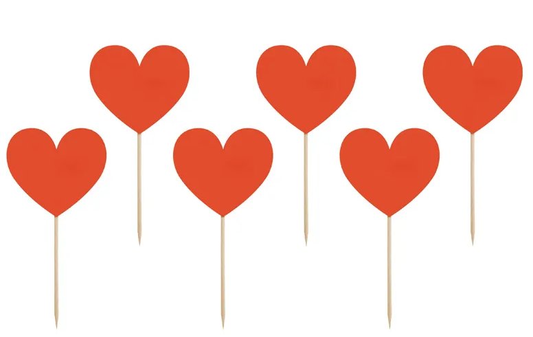 W zestawie sześć karteczek na piku z motywem czerwonego serduszka. Każda dekoracja ma wysokość około 11 cm (wraz z patyczkiem drewnianym).