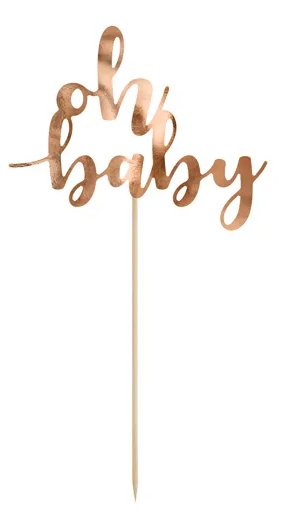 Topper na tort wykonany z papieru lustrzanego w kolorze różowego złota. Napis "Oh Baby" przymocowany jest do drewnianego patyczka który wbijamy do tortu. Wysokość dekoracji to ok. 25 cm.