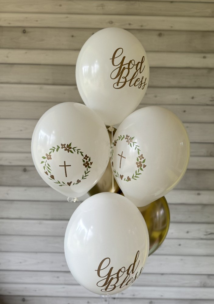 Zestaw balonów lateksowych o średnicy 30 cm. Baloniki idealne jako dekoracja na Chrzest lub Komunię Świętą. Zestaw składa się z 6 balonów: 2 x złoty chromowany , 2 x z napisem "God Bless", 2 x z ornamentem roślinnym. Wybierz opcję z boku: same balony, balony wypełnione helem, balony uszczelnione żelem.