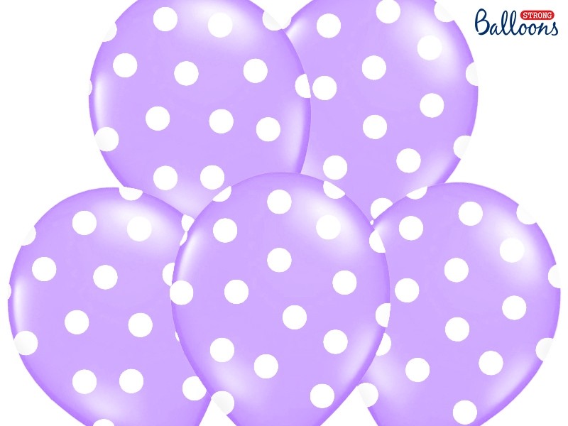 Balon Strong w kolorze fioletowym w białe kropki. Nadruk na balonie pięciostornny. Balon sprawdza się jako dekoracja, prezent bez okazji czy podarunek dla miłośników kropeczek. Przed wrzuceniem balonu do koszyka dokonaj wyboru: -sam balon czy np. -balon + hel.