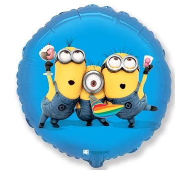 Foliowy, okrągły balon. Po napełnieniu helem utrzymuje się w powietrzu przez kilka dni. Balon 18 calowy (45 cm) przedstawia trzy Minionki na niebieskim tle.