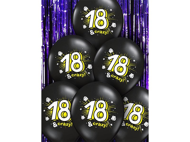 Piękne balony na 18 urodziny. Jasny biało złoty napis na czarnym balonie "18 & Crazy". Doskonały pomysł na dekorację przyjęcia urodzinowego.