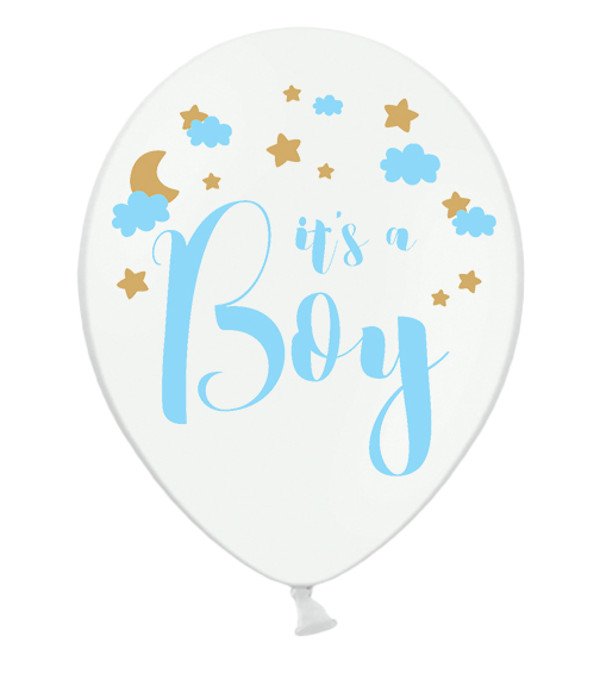 Biały, pastelowy balon z dwustronnym, błękitno-złotym nadrukiem "It's a Boy" o średnicy 30 cm (12 cali). Idealny na Baby Shower lub wizytę w szpitalu.