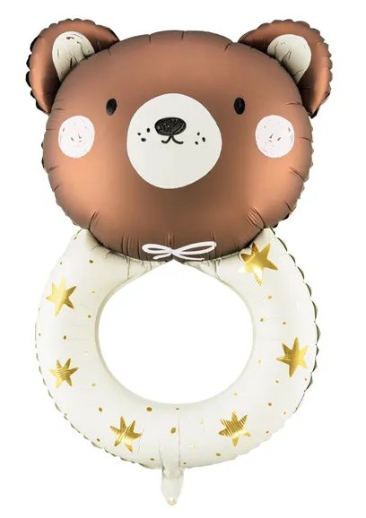 Piękny, duży balon foliowy w kształcie uroczej grzechotki - misia. Wspaniała dekoracja na imprezę urodzinową dziecka lub baby shower.