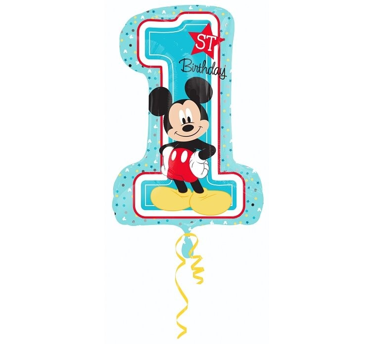 Foliowy, wielki balon na pierwsze urodziny chłopca w kształcie cyfry 1 z nadrukowaną myszką Mickey.