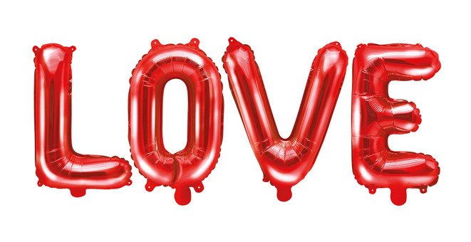 Foliowy balon z frazą LOVE (miłość). Do napełnienia powietrzem. Balon nie unosi się nawet po napełnieniu helem. Można go przymocować za pomocą taśmy dwustronnej do ściany lub do dużych balonów na Hel, np. w kształcie serduszka.