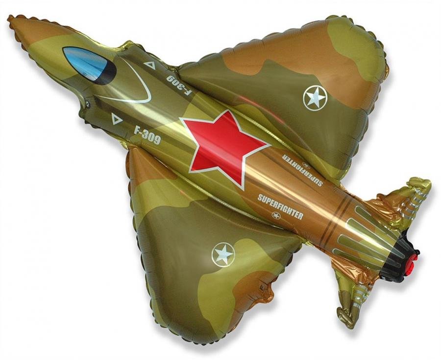 Foliowy balon w kształcie myśliwca wojskowego który można napełnić powietrzem lub helem. Balon ma 24 cale (około 90 cm).
