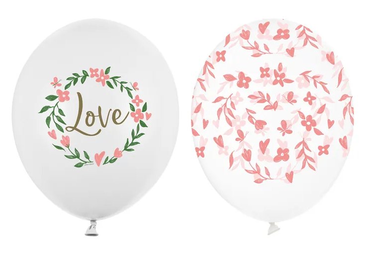 Miks balonów lateksowych utrzymanych w stylistyce boho. Do wyboru biały pastelowy balon z napisem "Love" oraz ornamentem roślinnym lub przeźroczysty z różowymi kwiatami. Składając zamówienie wpisz w komentarzu który wzór wybierasz.