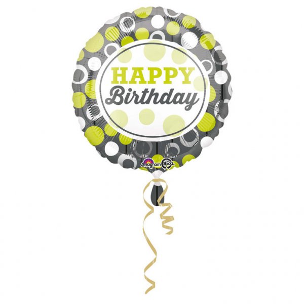 Okrągły balon w kolorach zieleni nadrukowanym napisem "Happy Birthday" idealny na urodziny kobiety lub mężczyzny.