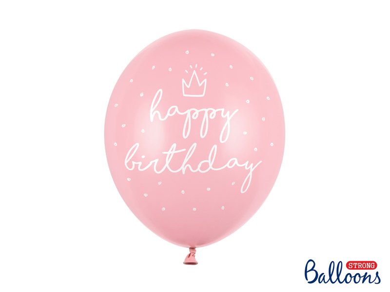 Balony w kolorze pastelowym różowym z białym napisem Happy Birthday. Nadruk na balonach jest dwustronny. Idealnie komponują się z gładkimi różowymi i białymi balonami. Idealna dekoracja na urodziny dziewczynki.