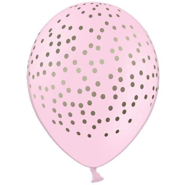 Balon o wymiarach 12'' czyli okolo 30cm, kolor różowy, nadrukowane złote kropeczki w stylu confetti. Balon nadaje się do napelnienia powietrzem jak również helem. Dodatkowo można go uszczelnić, aby unosił się w powietrzu około tygodnia.