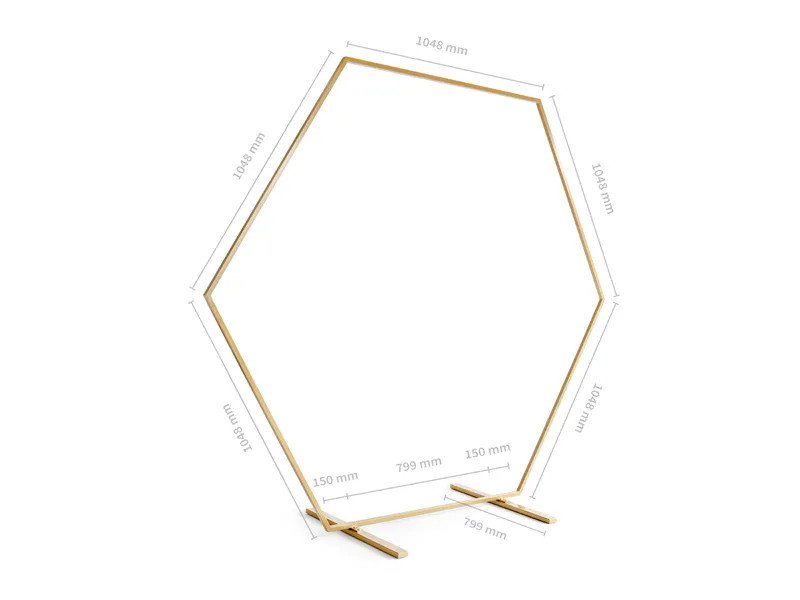 Polecamy do wynajęcia na kilka dni stojak na tło w kształcie heksagonu. Stojak wykonany jest z metalu w kolorze złotym. Produkt jest bardzo łatwy w montażu, po złożeniu stanowi stabilną konstrukcję o średnicy 2 metrów. Nadaje się do wielokrotnego użycia, idealny do zdjęć na weselu, komunii czy rocznicy ślubu.