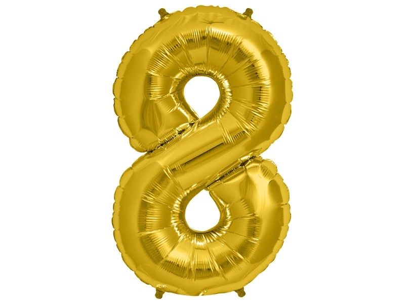 Foliowy, wielki balon w kształcie cyfry 8. W połączeniu z inną cyfrą może posłużyć na różne okazje. Balon jest w kolorze złotym, unosi się w powietrzu przez około 2 tygodnie! Balon wraz z helem kosztuje 45 zł. Hel dostępny tylko w lokalu w Krakowie.