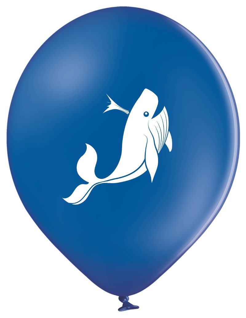 Śliczny biały wieloryb na niebieskim balonie. Wieloryb nadrukowany jest z dwóch stron. Pięknie prezentuje się w bukiecie z innymi zwierzątkami. Stwórz bukiet z balonów dobierając inne zwierzątka.
