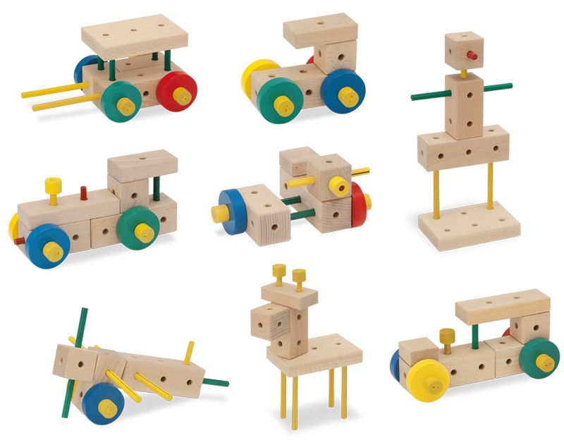 Zestaw drewnianych klocków konstrukcyjnych które łączymy za pomocą kołeczków w różnych kolorach i o różnych długościach. Podczas zabawy dziecko dysponuje dołączonym do zestawu drewnianym młotkiem, szczypcami oraz klinem. Zestaw składa się z 70 części, narzędzi oraz instrukcji.
