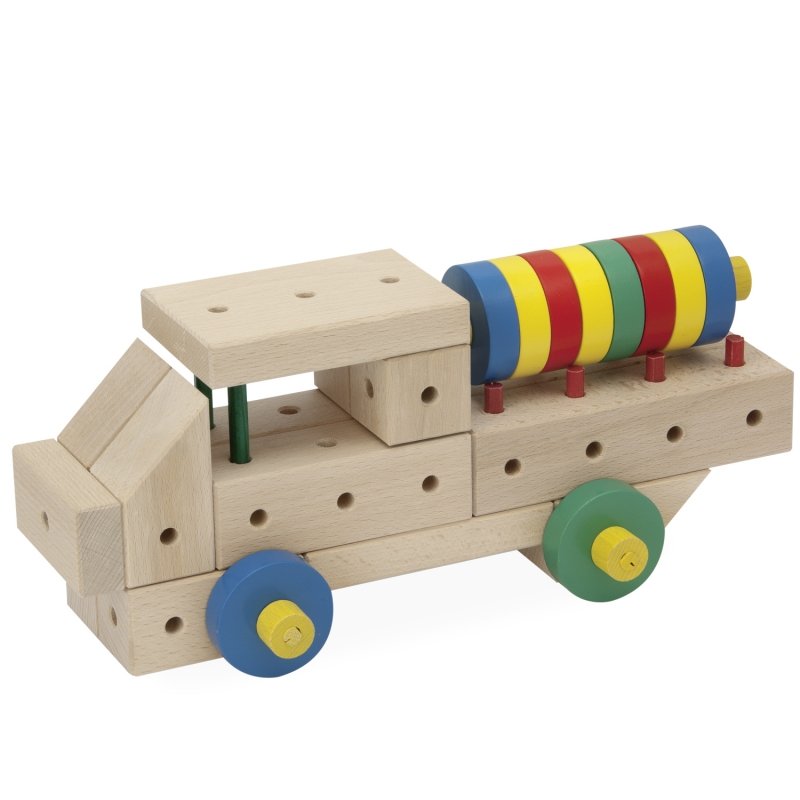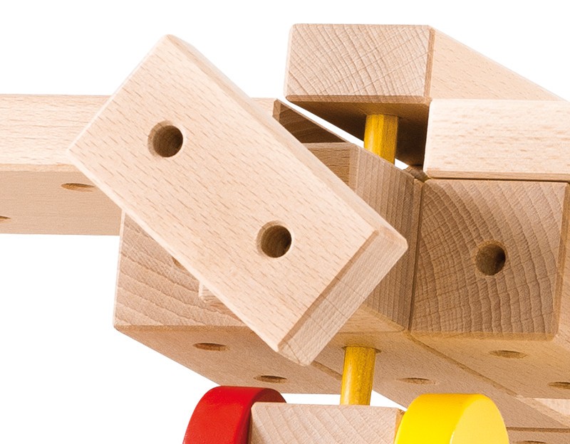 Drewniane klocki konstrukcyjne. Klocki łączymy za pomocą kołeczków w różnych kolorach i o różnych długościach. W zestawie znajduje się także drewniany młotek, szczypce, klin oraz instrukcja. Na zestaw składa się 175 części.