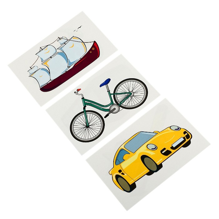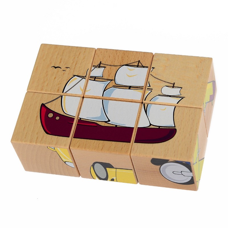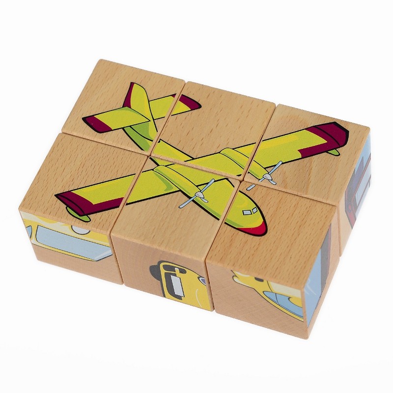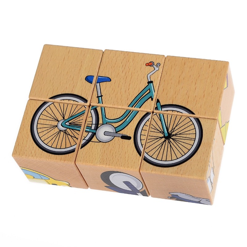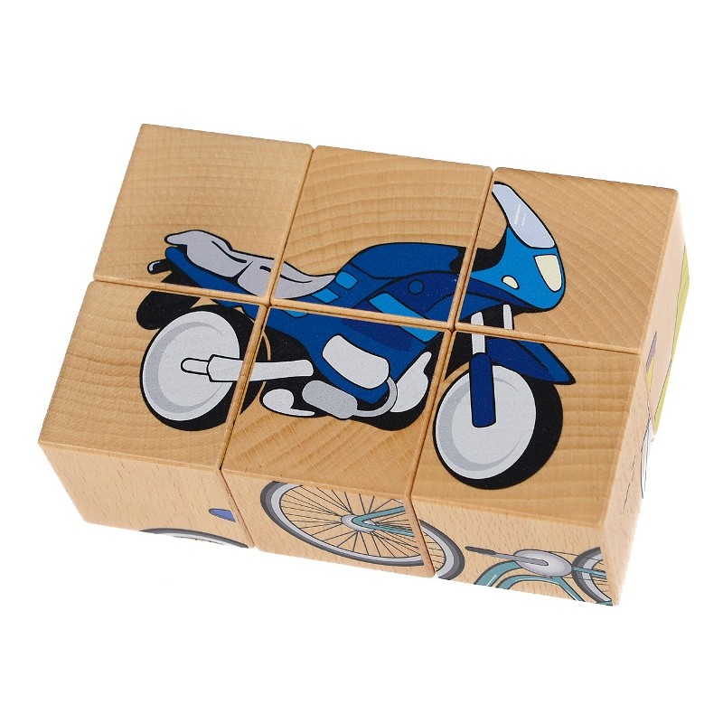 Zestaw 6 drewnianych sześcianów (drewniane puzzle) z obrazkami. Na każdej ścianie klocka znajduje się element innego obrazka. Prawidłowo ułożone dają 6 różnych możliwości ułożenia obrazków przedstawiających rózne pojazdy, w tym rower, statek, autobus czy tez np motor.