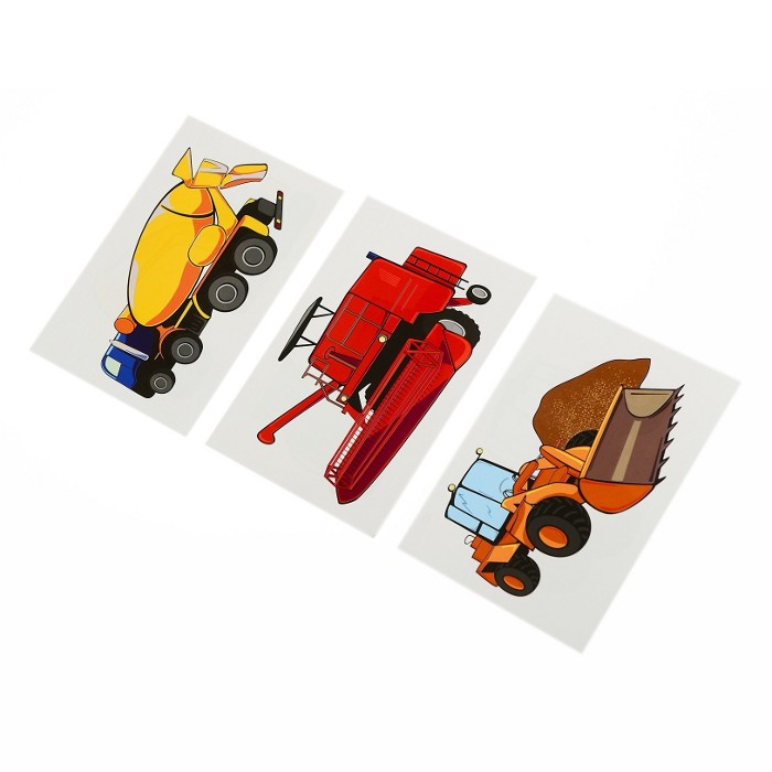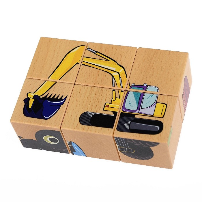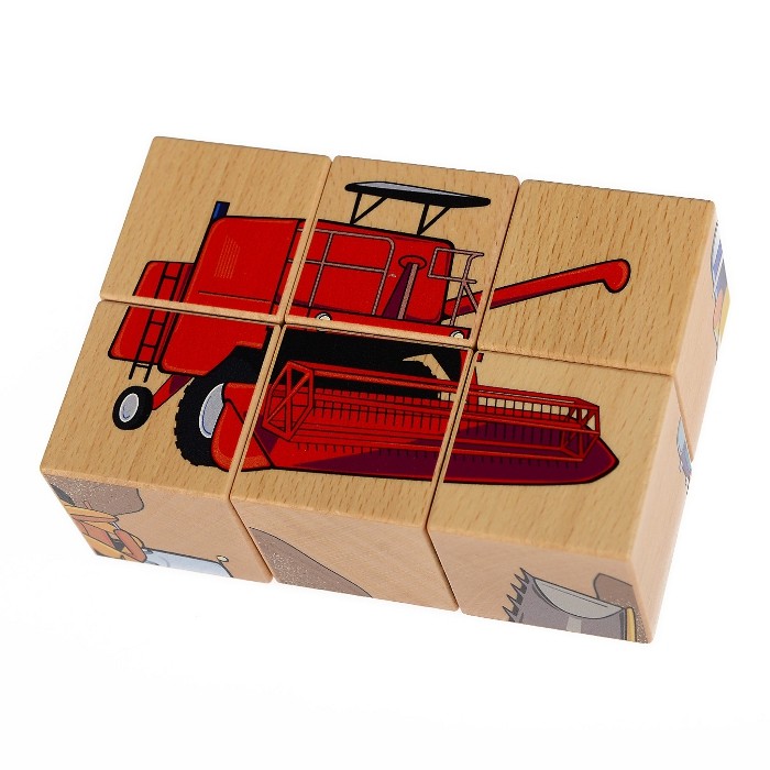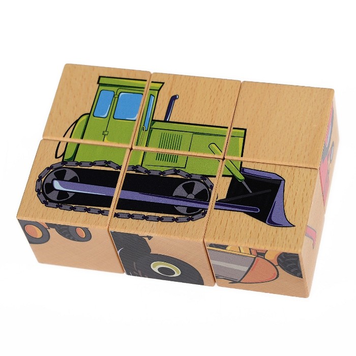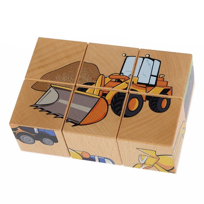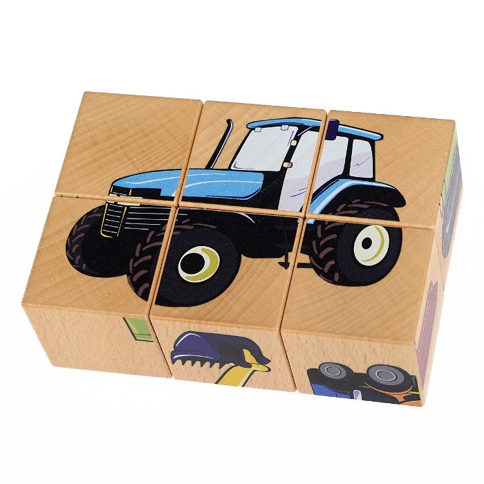 Zestaw 6 drewnianych sześcianów z obrazkami. Na każdej ścianie klocka znajduje się element innego obrazka. Prawidłowo ułożone dają 6 różnych możliwości ułożenia obrazków przedstawiających różne maszyny, w tym betoniarkę, traktor, kombajn czy tez np koparkę.