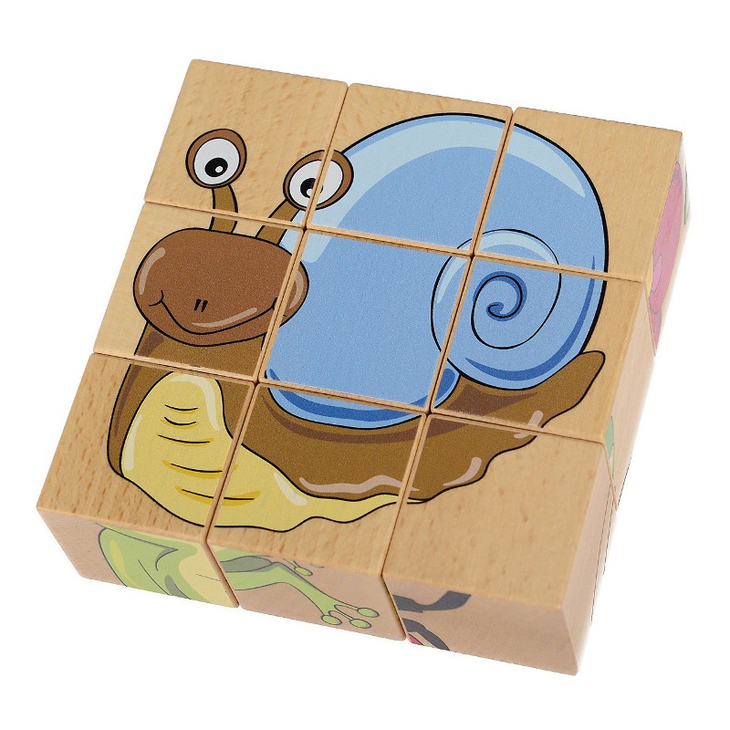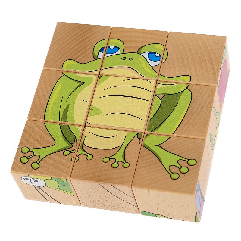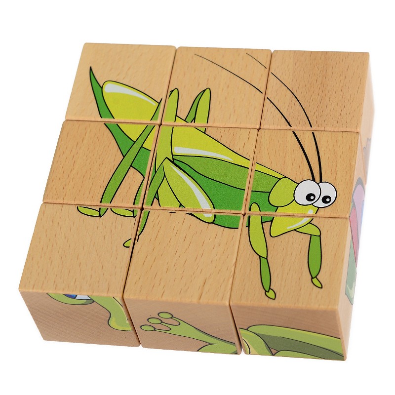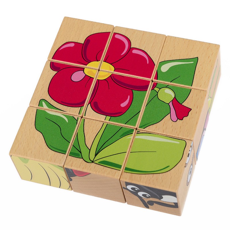 Zestaw 9 drewnianych klocków sześcianów z obrazkami. Na każdej ścianie klocka znajduje się element innego obrazka. Prawidłowo ułożone dają 6 różnych możliwości ułożenia obrazków przedstawiających zwierzęta oraz kwiaty polskich łąk.