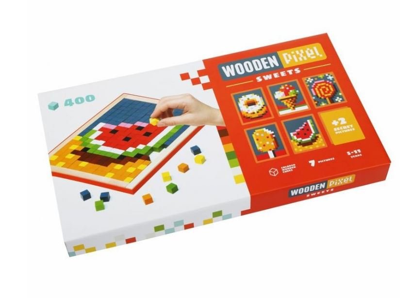 Zestaw zawiera aż 400 kolorowych pikselków - drewnianych klocków w kształcie sześcianów oraz 7 projektów według których układamy obrazki (tematyka słodkości).