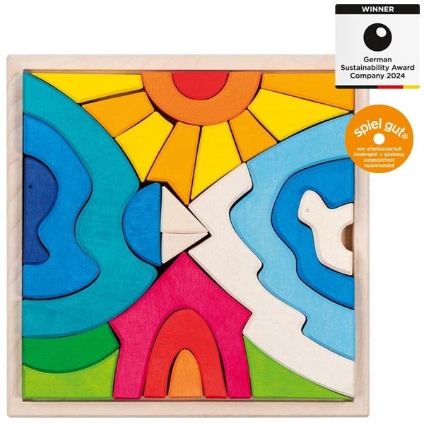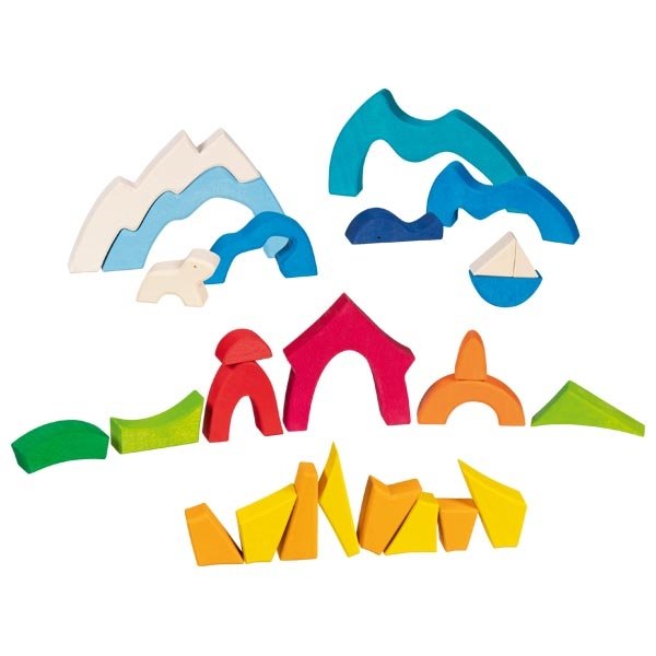 Pięknie wykonana drewniana układanka składająca się z 26 kolorowych elementów o różnej wielkości i kształcie. Ilość konstrukcji jaką można z nich wykonać jest ogromna! Mogą być to krajobrazy, jaskinie, domek dla wieloryba i niedźwiadka oraz wiele innych. Zabawka pobudzi wyobraźnię do działania!