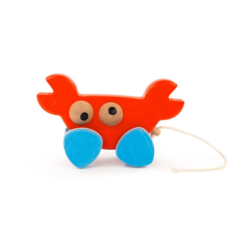 Śliczny drewniany krabik na ruchomych kółeczkach. Dzięki sznureczkowi dziecko może zabrać zabawkę na spacer.