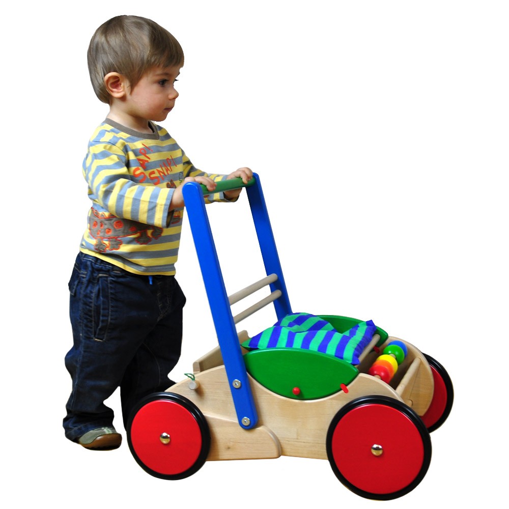 Solidny chodzi pchacz wykonany z drewna. Doskonały przy nauce chodzenia. Zabawka wielofunkcyjna: pchacz, chodzik, wózek do przewożenia, kołyska dla pluszaka, schowek na zabawki (duże, kolorowe korale jak w liczydle), zabawka motoryczna.
