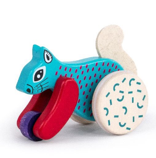 Drewniana skacząca wiewiórka, której wzornictwo inspirowane jest meksykańskimi Los Alebrijes.