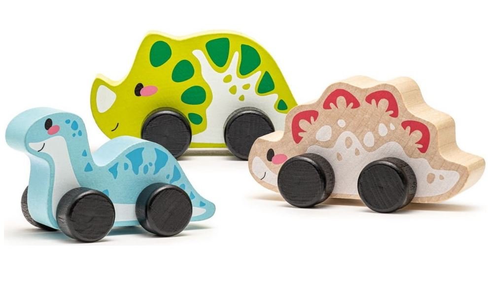 Trzy radosne dinozaury na kółeczkach. W całości wykonane z drewna. Wciągająca zabawa, która ćwiczy małą motorykę!