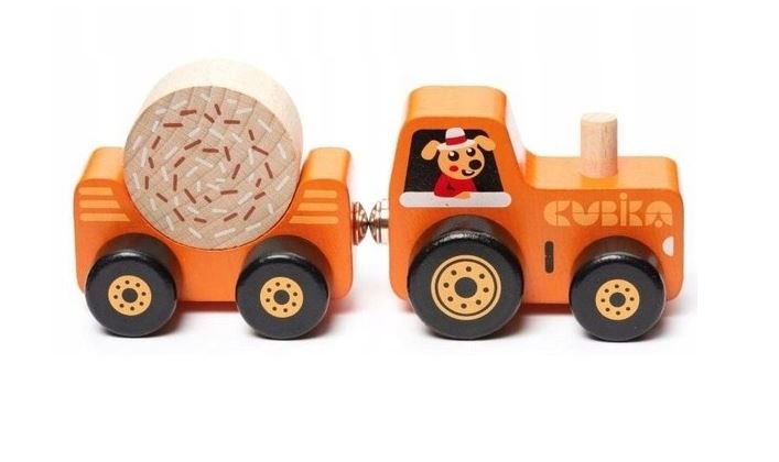Drewniany traktor na kółeczkach ciągnie przyczepę na której jest słoma. Całość możemy ciągnąć lub pchać. Przyczepa dopinana jest za pomocą magnesu, co uatrakcyjnia zabawę. Wciągająca zabawa, która ćwiczy małą motorykę!