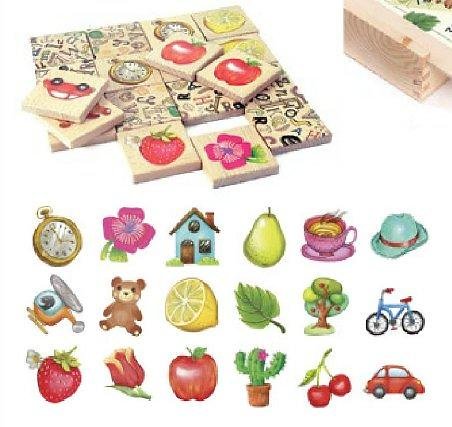 Popularna wśród dzieci gra memory wykonana z drewna. Zestaw zawiera 36 bloczków z obrazkami przedstawiającymi podstawowe przedmioty - świetna gra edukacyjna dla najmłodszych pociech.