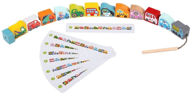 Zabawka dla dzieci już od lat 3. Zestaw składa się z 12 drewnianych elementów, sznurka z ogranicznikiem na końcu i długą drewnianą igłą. W zestawie także 8 kart z zadaniami.