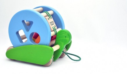 Drewniany ślimak do ciągnięcia na sznureczku. Przy ciągnięciu bębenek zawierający klocki obraca się. Bębenek ślimaka można ściągnąć, pełni on wtedy funkcję sortera kształtów.