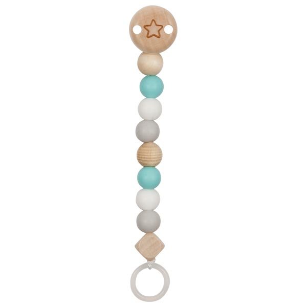 Drewniana zawieszka do smoczka z jednej strony zakończona klipsem, który można przyczepić do ubranka dziecka, z drugiej silikonową pętelką do której przywiązujemy smoczek. Pastelowa kolorystyka - jak na zdjęciu. Zapakowano w firmowe pudełeczko.