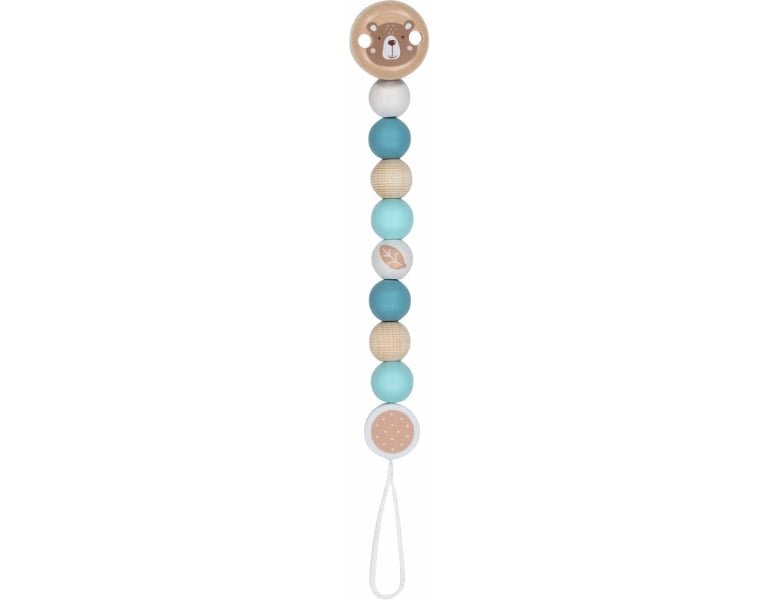 Drewniana zawieszka do smoczka z jednej strony zakończona klipsem, który można przyczepić do ubranka dziecka, z drugiej silikonową pętelką do której przywiązujemy smoczek. Pastelowa kolorystyka - jak na zdjęciu. Zapakowano w firmowe pudełeczko.