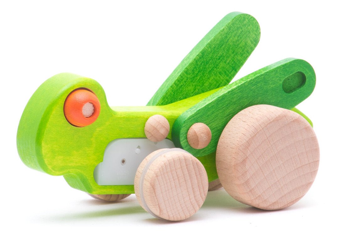 Drewniana cykada na kółeczkach, wprawiona w ruch nie tylko porusza skrzydełkami ale również wydaje bzyczący dźwięk niczym prawdziwa cykada. Długość: 13cm