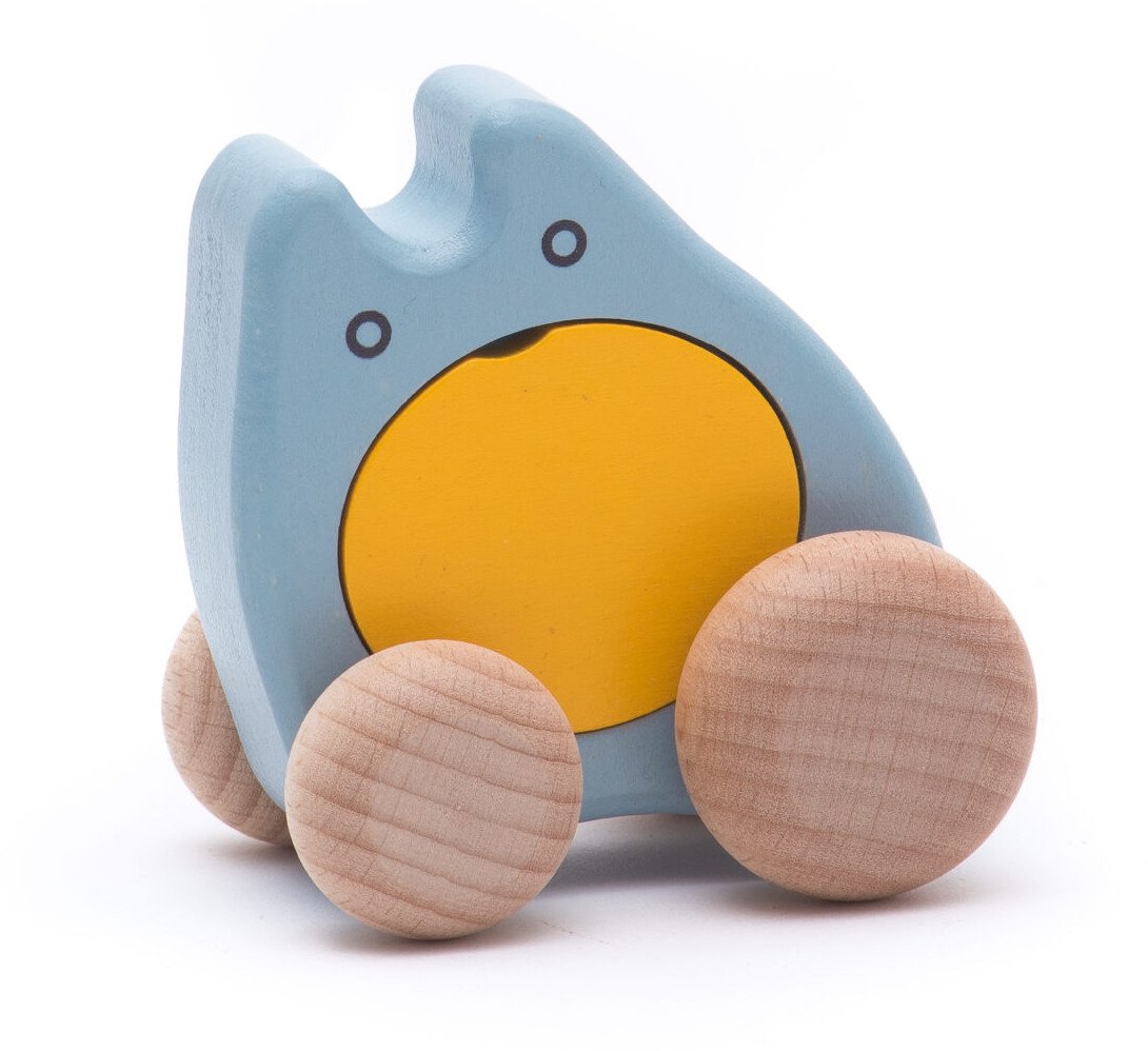 Mała, drewniana zabawka na kółkach - duszek. Świetna zabawka na prezent dla półtorarocznego dziecka. Duszek nie zajmuje dużo miejsca więc maluszek może go ze sobą wszędzie zabrać.