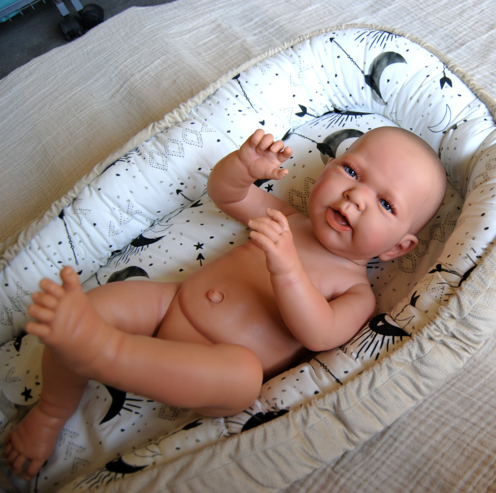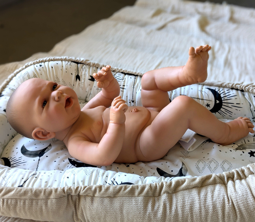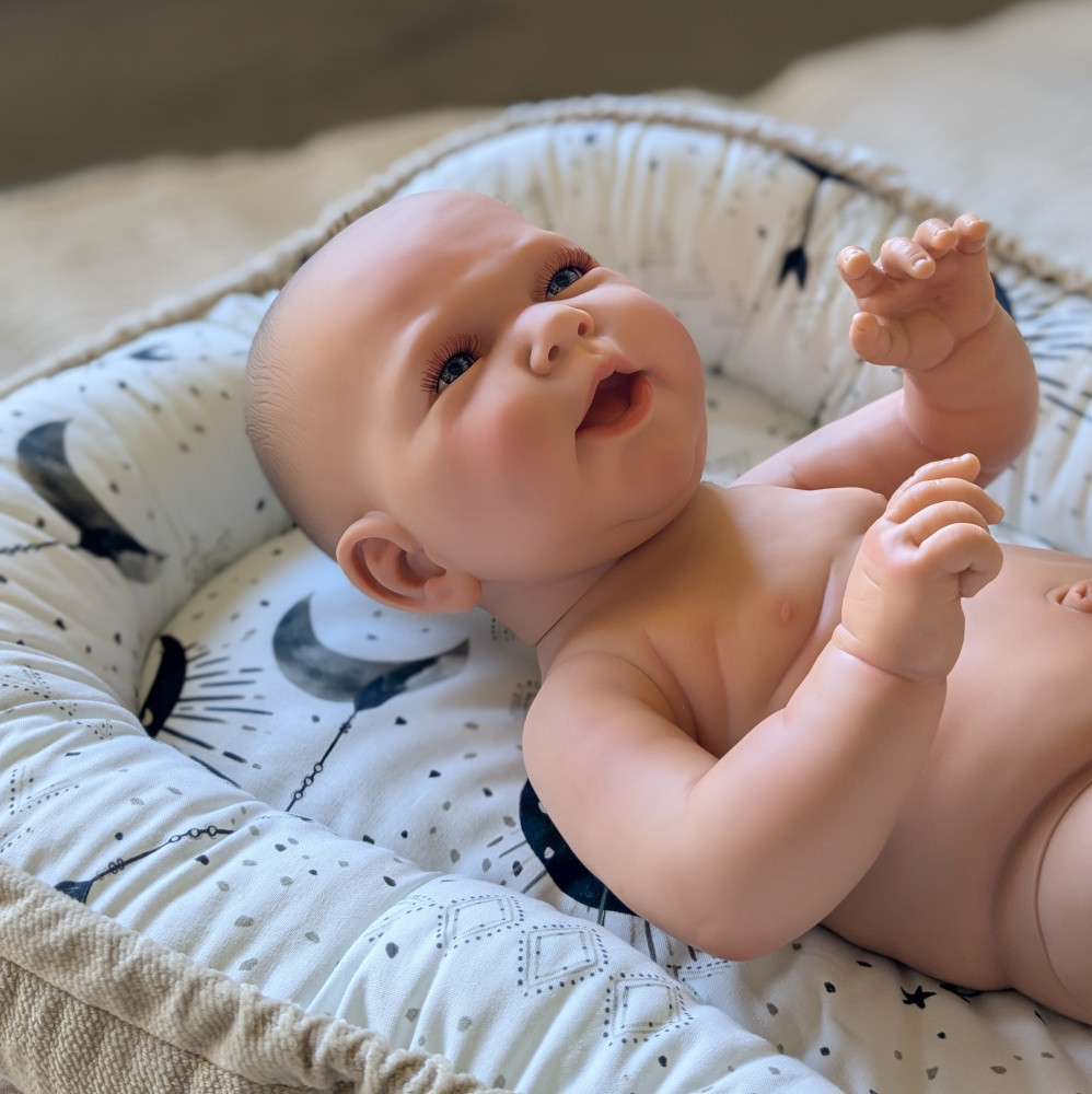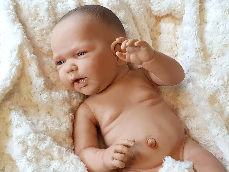 Laleczka jest bardzo starannie wykonana, zadbano o każdy szczegół taki jak słodkie fałdki, wystający pępek, żłobienia na główce przypominające delikatne włoski noworodka. Wzrok przyciągają niebieskie oczy i śliczne rzęsy.