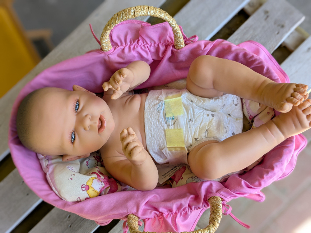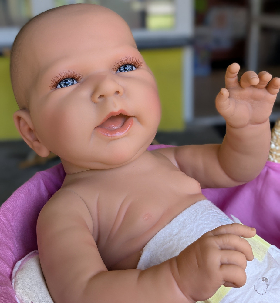 Piękna, duża lalka, w całości wykonana z winylu, wielkości noworodka. Idealna dla starszych dziewczynek oraz szkół rodzenia jako lalka pokazowa w nauce pielęgnacji maluszka.