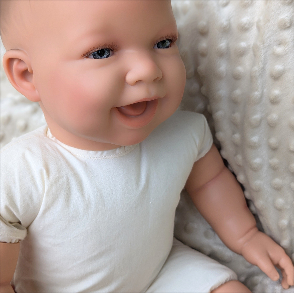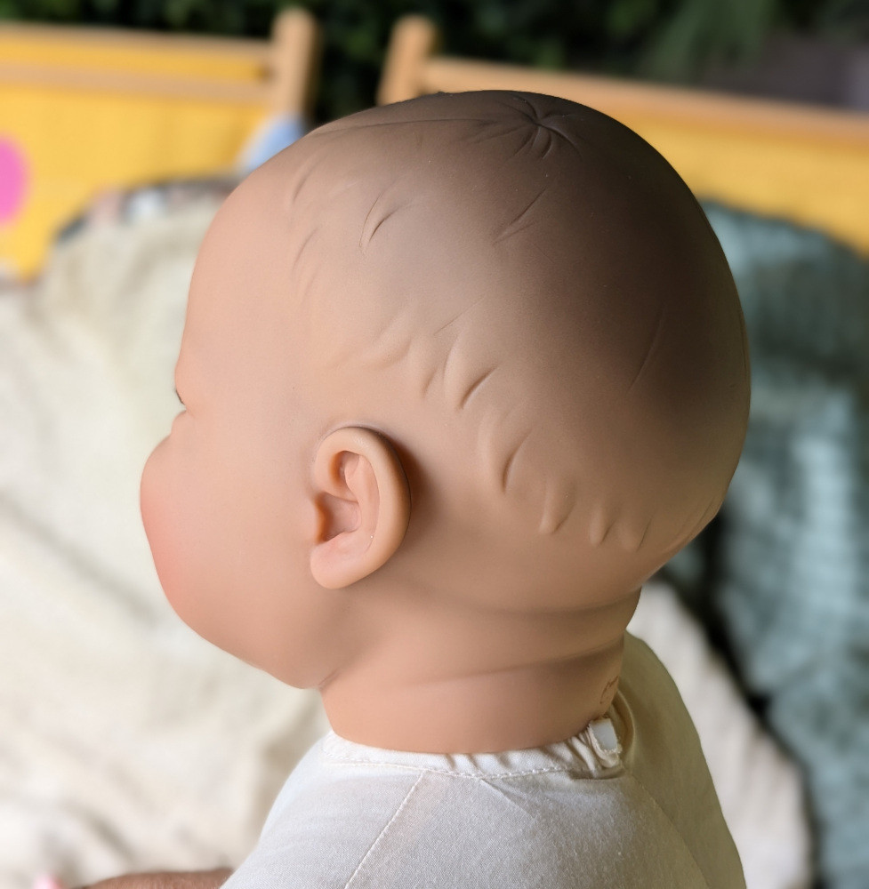 Oczy laleczki się nie zamykają. Zamiast włosków lalka ma na główce żłobienia, które doskonale imitują prawdziwe włosy niemowlaka.